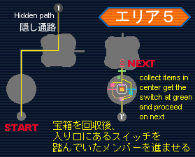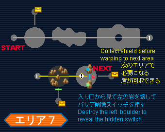 The Force can proceed through the fake wall to the left in the first room to procure the items if desired. Proceed to the warp after the long room, then move past the dark room with the rocks and break the rocks at the far end to open the door the next room. It is not necessary to collect the items. In the next room destroy the traps and the rock to the left and hit the switch to open the fence. All players except the Force should warp to the next area, while the Force proceeds past the area warp and through the fake wall to collect the shields from the boxes. (These are needed for the next area, so make sure you get them.) Then the Force can warp to the next area.