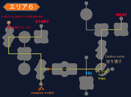 In the fifth room is the first item button, you must drop 4 weapons in the room to open the door. Note the weapons don't have to be dropped exactly on the button to open it. Carry on past the long room and have the HUcast/RAcast shoot the traps and break the rocks after the 4-way intersection. Continue on to the next area.