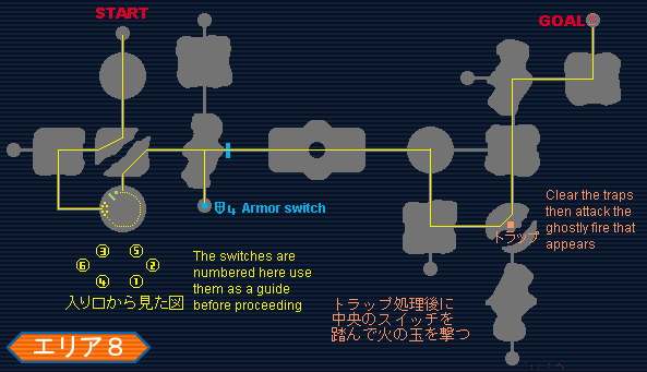 In the third room after the long room you get to play a little game of "Shoot the Flame Garment." All capable party members should equip Handguns and once someone steps on the button, the lights will go out and a blue flame will appear (it looks like an Aura Field.) Shoot it repeatedly and it will disappear and appear somewhere else. Shoot it again to repeat the process. Eventually it will change from an Aura Field to a Flame Garment, but the procedure is the same, keep shooting it. Once the Flame Garment appears in front of the door to the next room, the next time you kill it will end the game and open the door. Follow the map to the Goal, and you've cleared Stage 2!