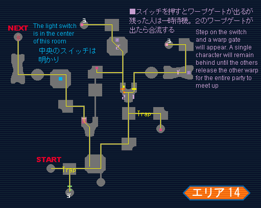 In the second room after the U room hit the left button marked green on the map to open the door and then clear the next room. Take warp 1 to be transported into the next room, which contains laser fences in the center making it difficult to move around as well as being dark with no light switch. Clear the room and move on to the next area.