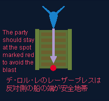 When the lights go out and De Rol Le prepares to use his purple laser beam attack, all players must move to the middle of the raft and hug the wall opposite De Rol Le to avoid getting hit by the blasts. This spot is marked on the map. Do not move from this spot until you are sure he has completed his laser volley, or you may get hit, and possibly 1 hit KOed. You must be physically touching the wall or you are not safe! Once De Rol Le goes down, Stage 4 and Cave are behind you!